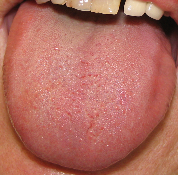 Jazyk je buď nateklý u dominujícího vlhka, nebo červený se žlutým povlakem u dominujícího horka.