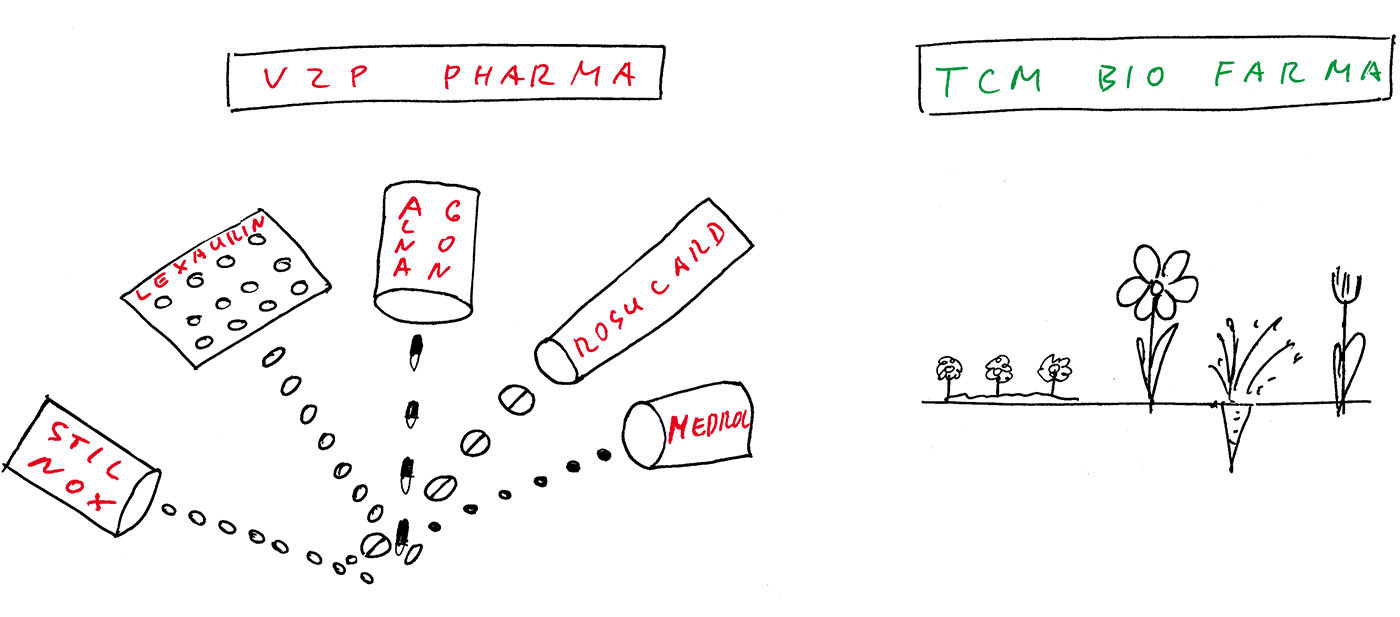 Jiný přístup k nemoci a k člověku má pak tradiční čínská medicína. Nejde jí o jednotlivou nemoc, ale o vyléčení celého člověka – vždy s ohledem na jeho konstituci, v našem příměru určitý typ auta. Dobrý lékař léčí nemoc. Vynikající lékař ale léčí pacienta, který má nemoc. Každý člověk je sice originál, ale přesto se dají vysledovat určité tělesné a duševní rysy specifické pro ten který typ, podobně jako jsou auta různých značek. Představte si kupř. jednoho člověka tlustého, červeného a často se potícího a druhého, který je hubený, bledý a zimomřivý, přičemž oba dva trpí „stejným“ typem bolesti hlavy. Takovíto pacienti by se pak měli dle západní medicíny (statisticky) léčit a vyléčit stejně. Jedna ze zásad TCM však říká: Stejné nemoci se léčí různě, různé nemoci se léčí stejně. Určité věci uvidí člověk jenom z určitého úhlu pohledu, jen určitým druhem pohledu… Už Hippokrates říkal: Je mnohem důležitější vědět, jaký typ člověka má nemoc, než vědět, jaký typ nemoci člověk má. Staří mistři tradiční čínské medicíny vždy za nejdůležitější považovali konstituci každého člověka a řídili se zásadou: Vše závisí na konstituci pacienta! TCM je totiž založena na zkušenostech (experience), které jsou ověřeny po staletí až tisíciletí na rozdíl od západní medicíny, která vychází z opakovaných pokusů (experiment). To však zdaleka není to samé. Dle TCM nemůžeme do různých typů aut líti stejný olej. Západní medicína „léčí“ auto, které má sice čtyři kola a volant,